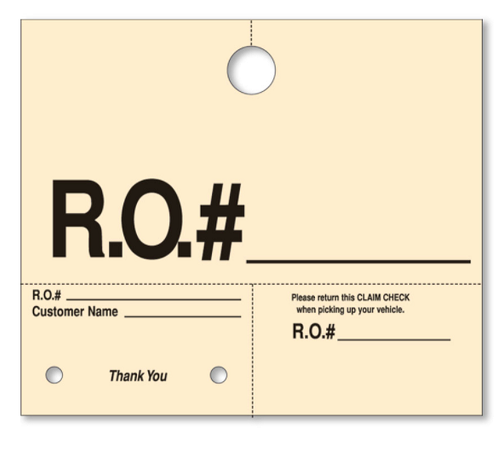 Un-numbered manila tags provide an economical way to identify repair jobs. Features perforated key tag and claim check.