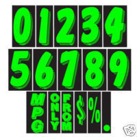 e a year model or price. Sold by the dozen {12 per pack}. Size: 7 1/2″ tall x 4″ wide. Neatly shrink wrapped in packs of a dozen with a chipboard backer to prevent curling during storage. Made of durable, waterproof vinyl, these bright, fluorescent windshield numbers demand attention! Each number is slit on the back for easy application. Removable adhesive allows easy, clean removal. Please note these car dealer stickers are not reusable. Order your ORIGINAL Fluorescent 3-D shaded design, adhesive windshield numbers from us! We stock these popular car dealer stickers in many colors and sizes.