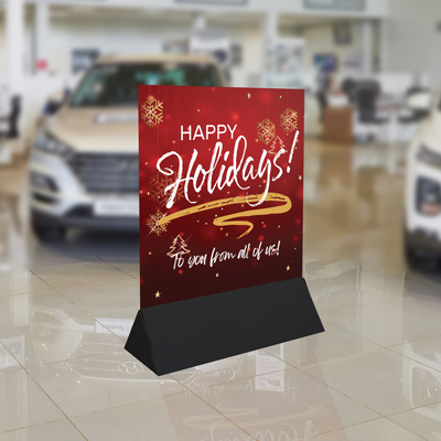 Display your holiday spirit with an indoor holiday billboard! Size: 30in wide x 41in tall. Signs are made of coroplast This display is frame-less which makes it easy to swap stock signs. Includes black mounting base Each sign is full color, digitally printed, double sided and will give your event and seasonal message the visibility it deserves. Intended for indoor use.