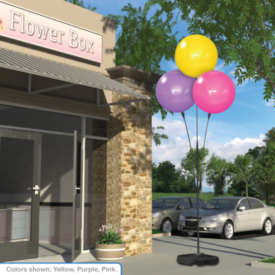 DuraBalloon Triple Cluster Pole Kit The Triple Cluster Kit is perfect for catching attention! It is a new spin on the residential housing industry favorite. DuraBalloon® means you never have saggy or deflated balloons but you do have the most weather-proof and durable HeliumFree™ balloon system in the world! The staggered balloon look of the triple cluster bouquet is sure to grab the attention of passing traffic. The kit has everything you need, including a 25" anodized metal ground stake for landscape mounting, a Ground Plate to keep it securely above the ground surface, a thick 6061 aluminum cluster pole with snap-button locators and a mounting bracket, 3 of the industries toughest 41" coated fiberglass stems, 3 upper holding cups and 3 DuraBalloon® Balloons Please choose 3 plain and/or message balloons from the pictures below and type your selections into the box above. Example: blue, red, yellow, black checker.