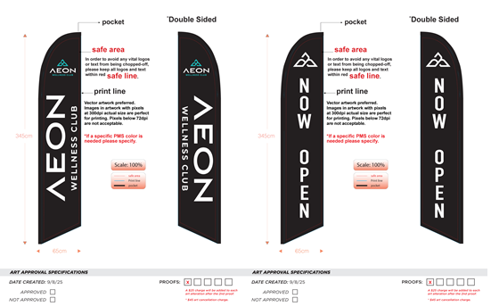 Custom Double Sided Aeon Wellness Feather Flag Draw attention easily with a giant message flag! This business flag can be used in grass, on concrete, or mounted to your building. This feather flag, also called a feather banner, has a vibrant colored background with bold graphics and text. Great for the front of your business or out by the road, this flag will flutter and flap with the slightest breeze This flag measures approx 2.5 feet wide by 11.5 feet tall. When installed on the flagpole it is nearly 15 feet tall. Constructed from UV treated, lightweight and affordable polyester. The printing on our flags is dyed-through so the message is visible from both sides. It has a sewn sleeve that easily slips over the specially designed flagpole. To use this flag you will also need to buy a flagpole and a flagpole holder --------------------------------------------------------------------- Buying the flag and hardware is as easy as 1-2-3 ! 1. Purchase your flag. 2. Purchase your flagpole set here. 3. Select your flagpole holder here. The item being sold : is one flag with the message shown above. The flagpoles and flagpole holders can be seen in our flag-hardware category.