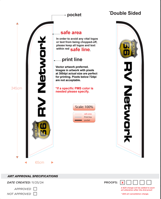 Custom Route 66 Double-Sided Feather Flag Nsfb-style This Feather Flag, also called a Feather Banner, has a vibrant colored background with bold graphics and text. Great for the front of your business or out by the road, this flag will flutter & flap with a slight breeze. This flag measures approximately 2.5 feet wide by 11.5 feet tall. When installed on the flagpole it is nearly 15 feet tall. Constructed from UV treated, lightweight and affordable polyester. The printing on our flags is dyed-thru so the message is visible from both sides. It has a sewn sleeve that easily slips over the specially designed flagpole that is sold separately. To use this flag you will also need to purchase the flag hardware. Normal ground installation requires a flagpole and a ground-spike. These can be added to your order by clicking the 2 check-boxes above. You can also view these items in our Flagpoles-&-Hardware category. If you would like to use your feather flag on a hard surface like concrete, please see our other mounting options in our FLAG HARDWARE section Purchase one of our feather banners today and get your business or event noticed!