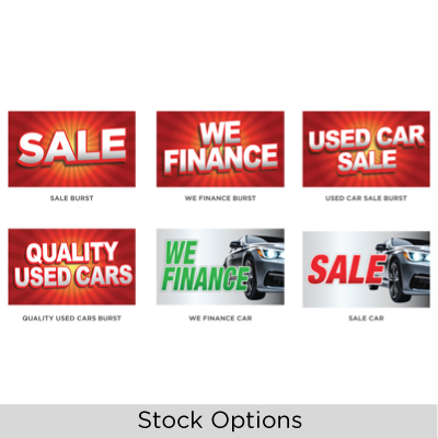 3x5ft stock vinyl banners designed to grab attention and drive traffic! Great for dealerships &retail store fronts! Use indoors and out doors. Grommets included on all sides. Rope ties included.